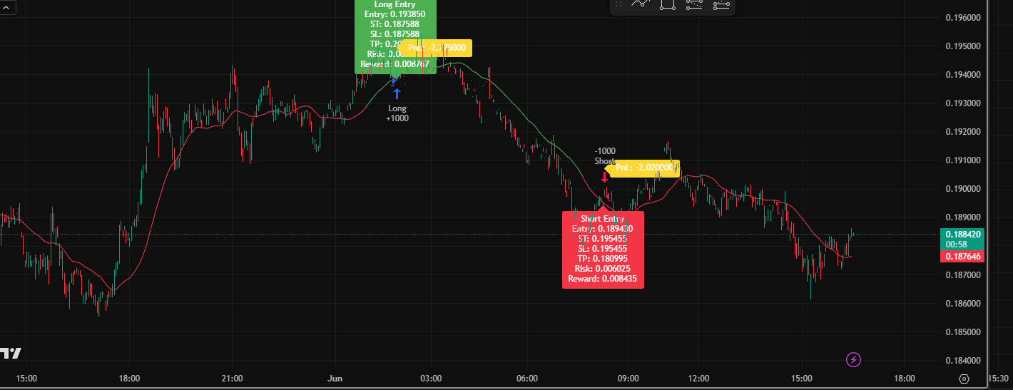 Entries are executed on the lower timeframe, specifically after a brief pullback identified by the price crossing the SMA, capitalizing on short-term retracements within the larger trend.